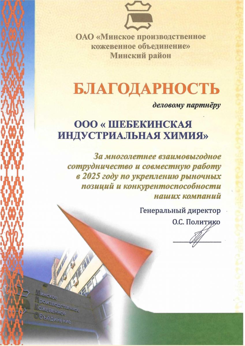The company Shebekinskaya industrialnaya khimiya, LLC (Russia) was thanked by JSC "Minsk Industrial Leather Association" (Belarus) for many years of mutually beneficial cooperation and joint work in 2025 to strengthen the market positions and competitiveness of the companies.